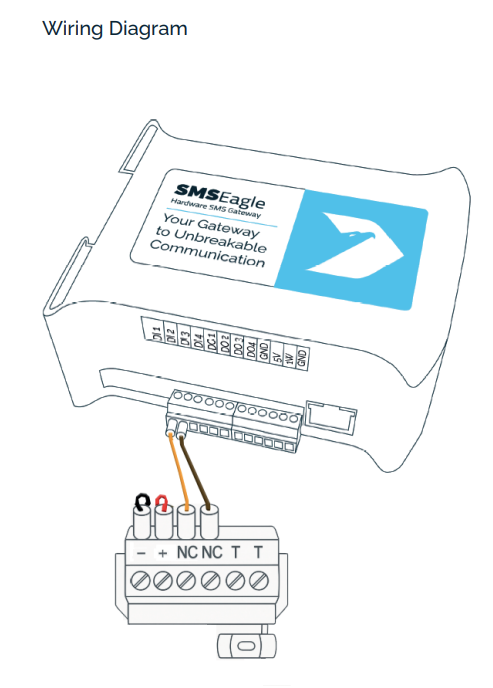 Der Sensor wird über die digitalen Eingänge eines SMSEagle-Gateways angeschlossen. Die Verdrahtung erfolgt wie folgt: