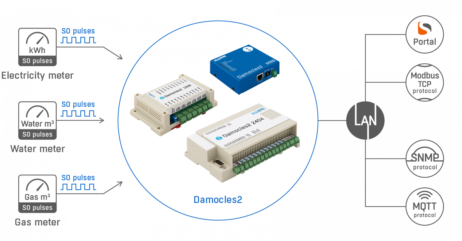 Damocles2 2404 verfügt über 24 digitale Eingänge (DI) für potenzialfreie Kontaktdetektoren. Alle digitalen Eingänge verfügen über S0-Impulszähler mit einem Speicher zum Anschluss von Wasser-, Gas-, Strom- oder anderen Zählern. Damocles2 2404 steuert 4 digitale Relaisausgänge (DO).