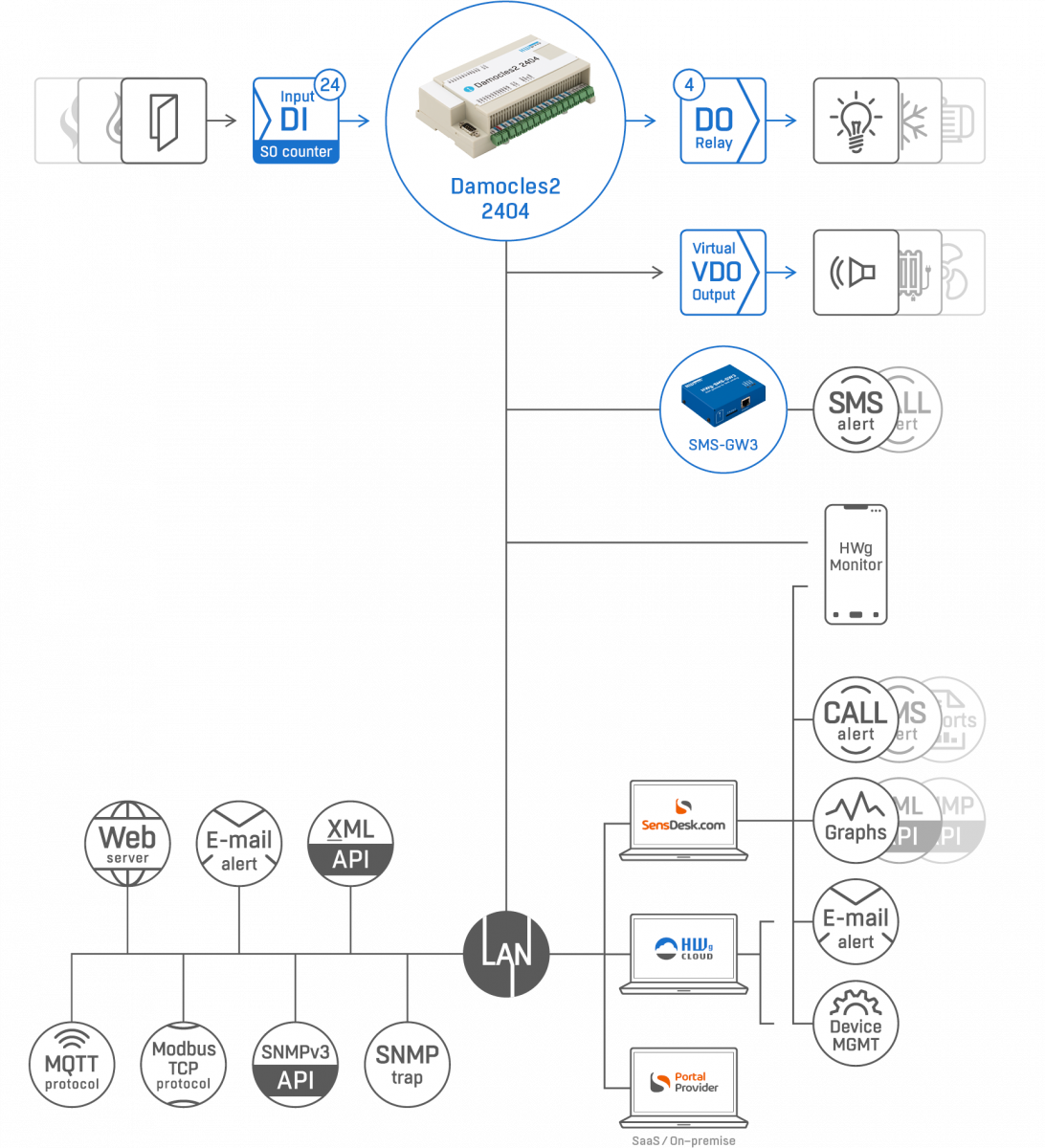 Damocles2-Geräte wurden entwickelt, um digitale I/Os über das Netzwerk unter Verwendung sicherer M2M-Protokolle (HTTPs, IPv6, SNMPv3) zu überwachen und zu steuern. Mit Unterstützung von über 50 SNMP- und SCADA-Anwendungen können Damocles2-Geräte in eine Vielzahl von Überwachungs- und Steuerungssysteme integriert werden. Das MQTT-Protokoll ermöglicht die Integration in IoT-Lösungen.