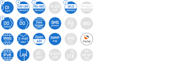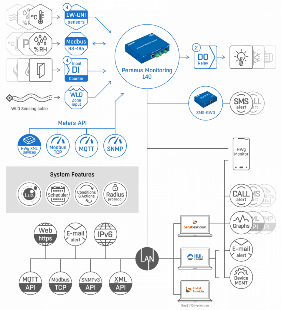 Das Messgerät kann E-Mail- oder SNMP-Trap-Benachrichtigungen senden und die Messwerte sind über Open API (XML, Modbus/TCP, MQTT) verfügbar. Perseus Monitoring 140 kann mit dem SensDesk-Portal verbunden werden, was es zu einer leistungsstarken Lösung für professionelle Anwendungen macht. Ein einzigartiges Merkmal der Perseus-Produkte ist die Zähler-API, die es ermöglicht, Sensorwerte von anderen Geräten zu analysieren und Alarmmeldungen zu generieren.