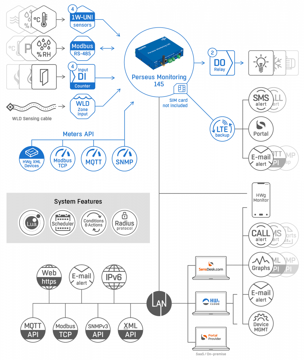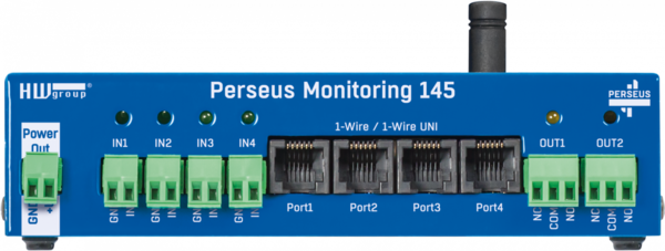 Das Messgerät ist ausgestattet mit 4x RJ11-Anschlüssen (1W-UNI), einer RS-485-Schnittstelle für Modbus/RTU, mehreren digitalen Ein- und Ausgängen (DI/DO (Relais)) sowie einem WLD-Anschluss für Leckage-Detektion und Wassererkennung. Der Perseus 145 kombiniert Daten von externen physischen Sensoren und Detektoren mit Daten anderer über LAN verbundener HW group-Geräte. Lokale Bedingungen, Lua-Skripting, Kalenderfunktionen oder periodische Zeitpläne unterstützen die Analyse der Messergebnisse.