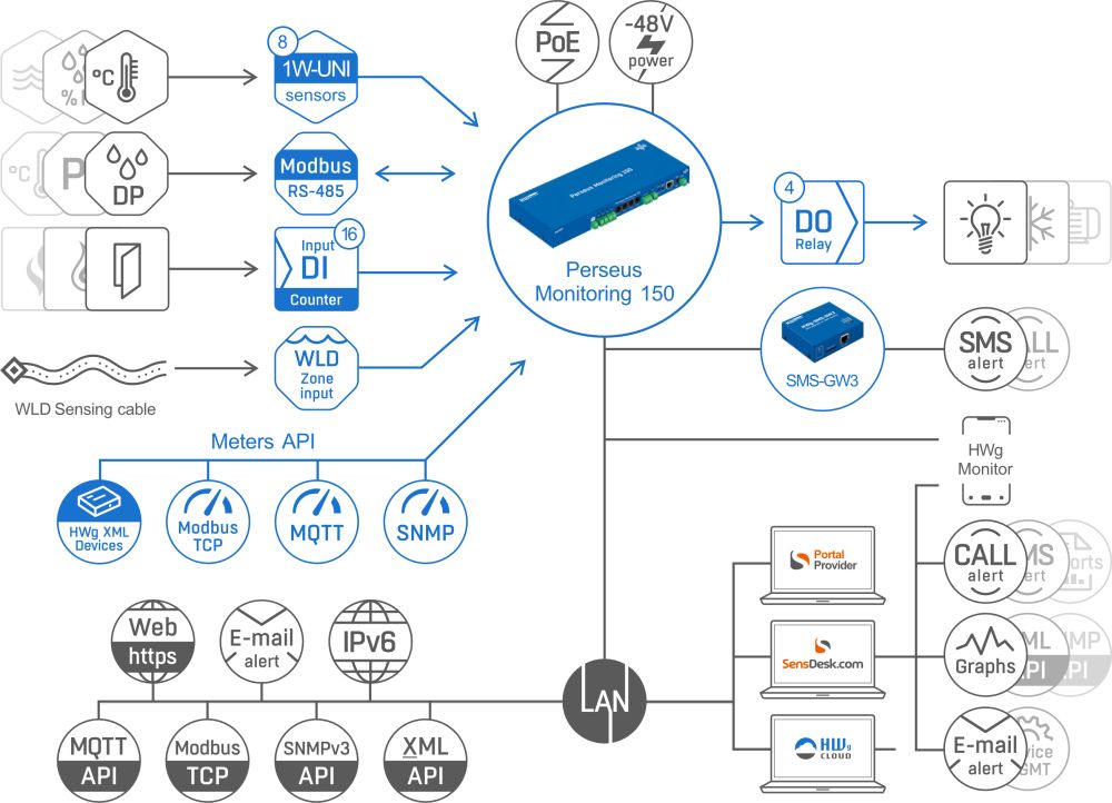 Die Lösung verfügt zudem über einen RJ45-LAN-Anschluss zur Verbindung mit anderen HW group Geräten, die über die Meters Open API als externe Zähler integriert werden können. Die Verwaltung der Sensoren und die Anzeige der Daten erfolgt über das Online-Portal SensDesk.at. Der Perseus Monitoring 150 unterstützt lokale LUA-Skripte, RADIUS (IEEE 802.1x) und Sensoren von Drittanbietern.