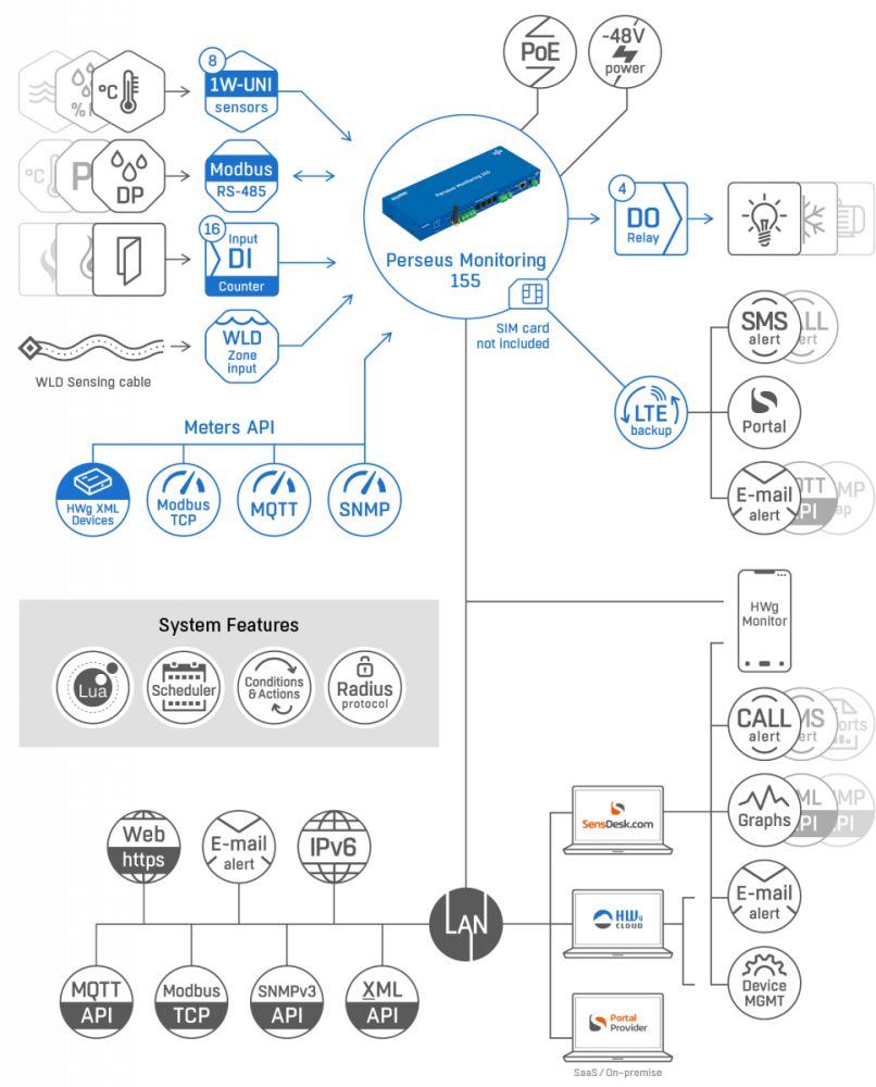 Der Perseus Monitoring 155 von HW group ist eine Fernüberwachungsplattform, die speziell für die Überwachung von 19-Zoll-Racks in Serverräumen und Rechenzentren entwickelt wurde. Das Gerät verfügt über 8 RJ11-Anschlüsse für 1W-UNI-Sensoren, einen WLD-Zoneneingang, einen 4-poligen RS-485-Klemmblock, 4x digitale Ausgänge und 16x digitale Eingänge.