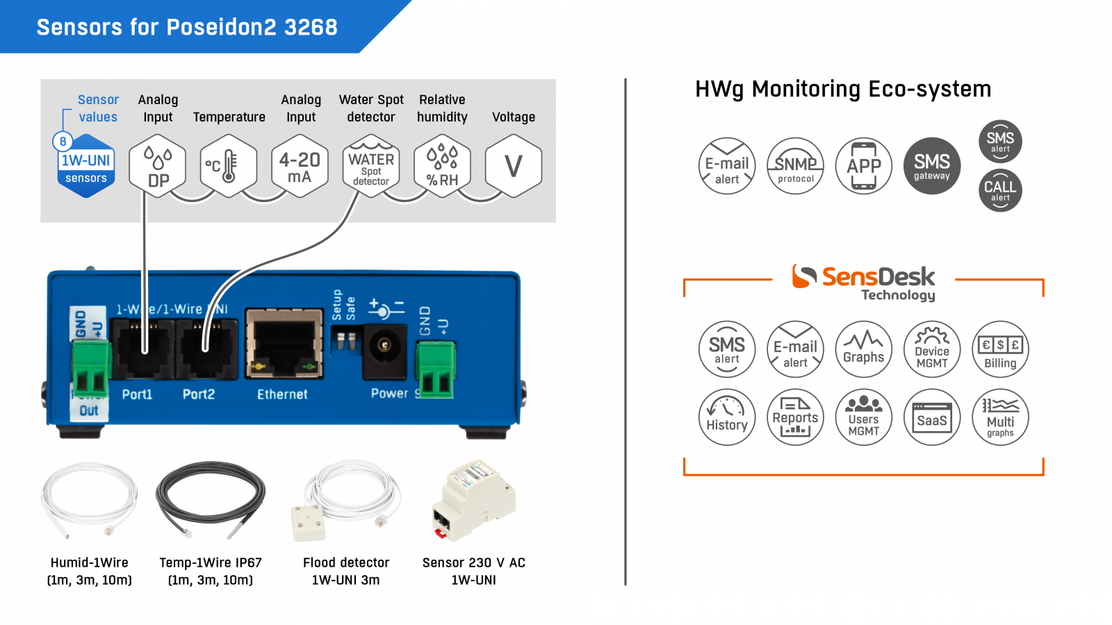Das Poseidon2-3268-Fernüberwachungsgerät unterstützt bis zu 8 Sensoren, 4 Digitale Eingänge (potentialfreie Eingänge) und 2 digitale Ausgänge NO/NC relay outputs (Relaisausgänge), sowie bis zu 8 virtuelle digitale Ausgänge (VDO) an weiter wegplatzierten Poseidon2- oder Damocles2-Einheiten (M2M) Machine-to-Machine. Poseidon2 ist mit dem LAN verbunden, liest Messdaten und speichert diese in seinem internen Speicher. I/O (E/A) kann über Ethernet kontrolliert werden. Relaisausgänge können über das Web kontrolliert werden oder in Abhängigkeit des Wertes eines verbundenen Sensors (“IP-Thermostat”- oder “IP-Hygrostat”-Modus).